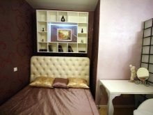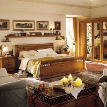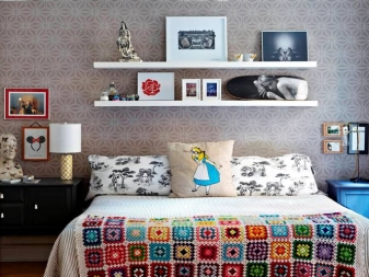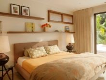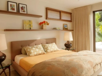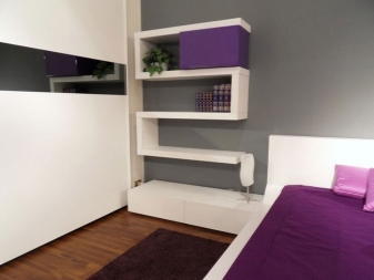 Друг вариант за използване на рафтове в спалнята е декорирането на зоната на будоара. Тук всичко може да се направи много просто. Достатъчно е просто да закачите голямо красиво огледало на стената и да поставите рафтове около нея.. Идеално – стъклени рафтове. Те ще се смесят добре с огледална повърхност. Тази опция за дизайн идеално ще се впише в стая в модерен стил. Всички козметични аксесоари могат да бъдат поставени на тези рафтове. Красиви буркани с кремове, парфюмни бутилки и декоративна козметика – всичко това ще бъде прекрасна декорация за вашата стая..