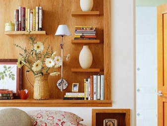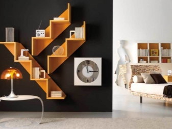 За да добавите акценти и да направите стенните рафтове част от интериора, те могат да бъдат осветени с помощта на малки LED светлини. Те могат да бъдат класически заострени или да имат необичайна форма..