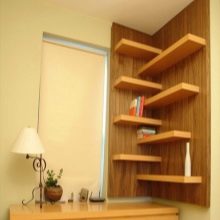 Такива продукти се различават и от какъв материал са направени.. Дървото е най -достъпният и популярен материал. Дървени рафтове могат лесно да бъдат направени със собствените си ръце. Освен това можете да ги украсите както желаете..