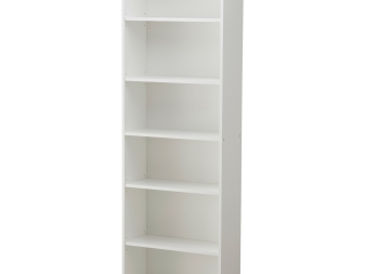 Този модел шкаф също е направен под формата на стелажи, които се вписват дори в най -малката стая. Стелажът се състои от много регулируеми по височина рафтове и един неподвижен рафт. Несменяемият елемент прави конструкцията по-здрава и стабилна. Препоръчва се закрепването на тесни стелажи към стената с помощта на винтове, дюбели или самонарезни винтове. Инструментите за закрепване не са включени в обзавеждането, така че вие сами ги избирате в зависимост от стената, към която ще бъде монтиран шкафът.