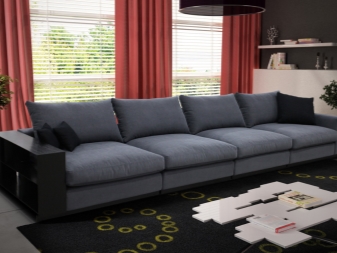 - Дизайн за голяма всекидневна, може да достигне размери от 4 до 6 метра дължина, в зависимост от параметрите на седалката, чиято ширина може да варира от 70 до 90 см. Такива модели най -често се правят по специална поръчка., в който можете да посочите размера на възглавниците и наличието или отсъствието на подлакътници.