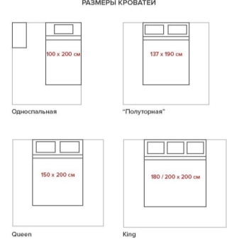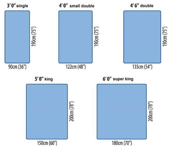 Когато се преведе в разбираеми сантиметри, дължината на двойно легло в САЩ и Австралия ще бъде приблизително 203 см, а в Англия – 198 см. Ширината също няма да отговаря на руските стандарти: място за спане в САЩ ще бъде с ширина максимум 193 см, а в други страни може да бъде 184 см.