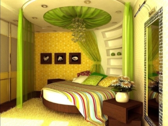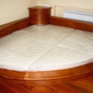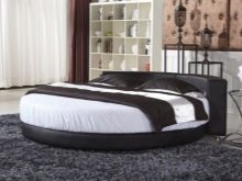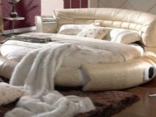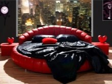 Друг вариант за доминиране на спалнята може да бъде кръгло легло.. Въпреки факта, че опцията за правоъгълно пастелно бельо очевидно не е подходяща за нея, производителите може да предложат да я направят по поръчка, такива искания не са необичайни. Важен момент е, че такъв обект няма да се впише във всеки интериор, той е присъщ на стила арт деко. Когато инсталирате кръгло легло в стая, трябва да се разбере, че повече или по -малко стандартен размер за него е диаметър 220 см.