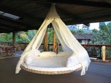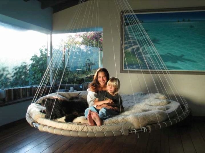 Често такова окачено легло се поставя близо до панорамен прозорец; поради играта на светлина, сякаш се носи във въздуха, което прави атмосферата в стаята по -спокойна. Няма специални правила за височината на такива легла, те могат да бъдат както високи, така и ниско над пода. Последният вариант е подходящ за семейства с малки деца, тъй като е по -безопасен..