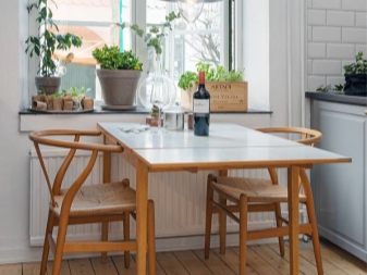 Дългите и тесни маси могат да седнат толкова хора, колкото и широки предмети. Не се страхувайте от липса на място, защото чиниите могат лесно да бъдат преместени в шкафове или някъде другаде, ако е необходимо.. Моля, обърнете внимание, че височината на работното място за рязане не може да бъде по -малка от 90 см по дължина, в противен случай готвенето ще бъде неудобно. За високи хора са подходящи кухненски маси с височина 94 сантиметра и по -висока.