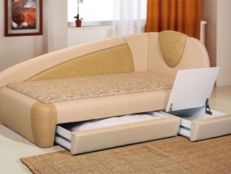 Този тип диван заема всички неизползвани ъгли, освобождавайки полезно пространство. Като правило ъгловият модел има удобен гръб, който също предпазва стената от триене. След трансформация разтегателният ъглов легло се превръща в двойно легло. Някои модели на продукта са оборудвани с удобен рафт, без който можете да поставите държач за цвете или салфетка.