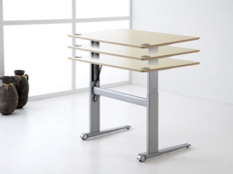 Регулируемата по височина конструкция на масата е много подобна на обичайните си колеги. Плотът за маса е фиксиран тук върху здрава рамка. Има продукти с две или три метални опори, чиято стабилност е максимално висока, или с една стойка-основа. Повдигащият механизъм е разположен в краката, които действат като опора, а товароподемността може да достигне 200 кг.