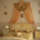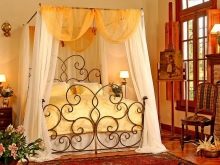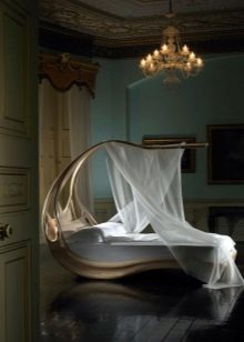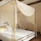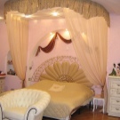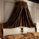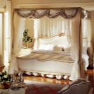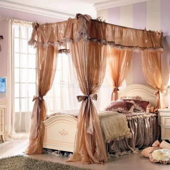Освен това – главният герой на дизайна е самият балдахин, който може да бъде ушит със собствените си ръце. Трябва да вземете парче плат с малък диаметър, което трябва да бъде предимно по -голямо от височината на леглото от всяка страна. По желание може да бъде украсена с допълнителни елементи: модел, златна плитка в ренесансов стил, сатенени панделки, които могат да заменят обикновени панделки.