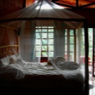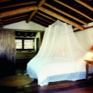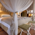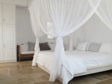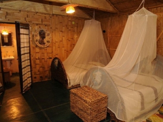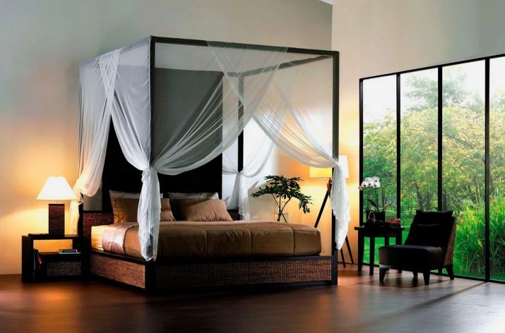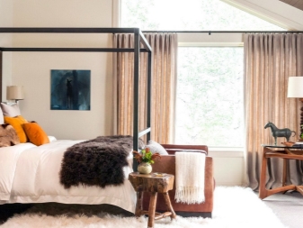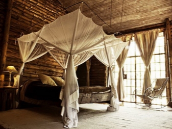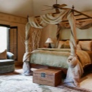За истинско африканско сафари, гигантско легло с балдахин е перфектно. Отличителен щрих ще бъдат килимите под формата на животински кожи, които трябва да бъдат разположени върху дървен под (подът от камък или порцеланов камък ще изглежда не по -малко правдоподобно и хармонично). За да засилят ефекта, завесите могат да приличат на мрежа против комари (или дори да бъдат).
