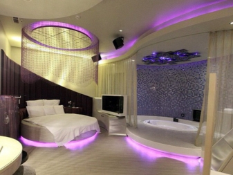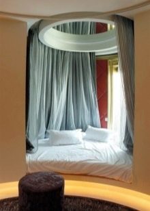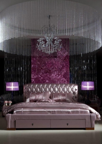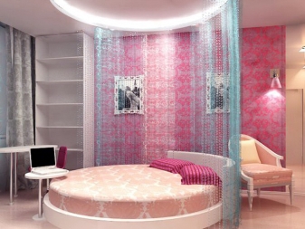 Интересно дизайнерско решение е кръгло двойно легло с балдахин. Не всеки любител на екстравагантното и екстравагантното е в състояние да вземе решение за това, защото такъв модел има някои недостатъци (впечатляващите си размери и проблеми при избора на спално бельо), но за модерен дизайн на стаята ще бъде много полезен, особено ако комбинирате необичаен вариант с него навес. Кръгло легло на подиум с балдахин от нишки – смел, закачлив и елегантен.