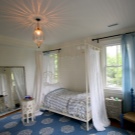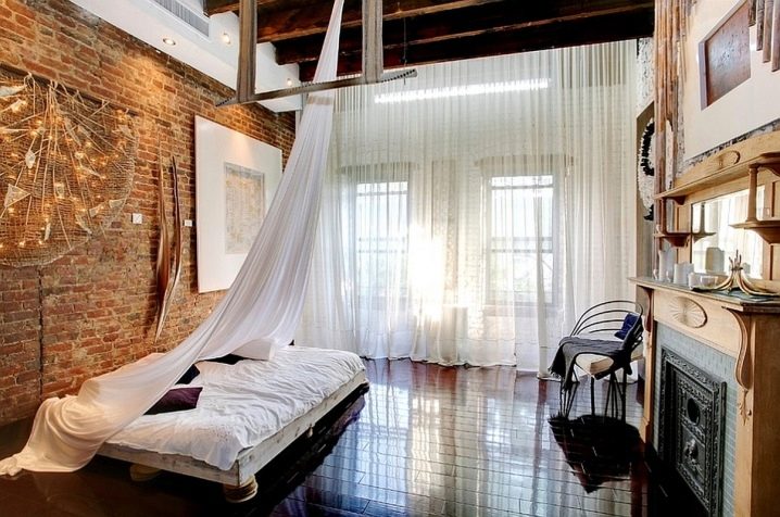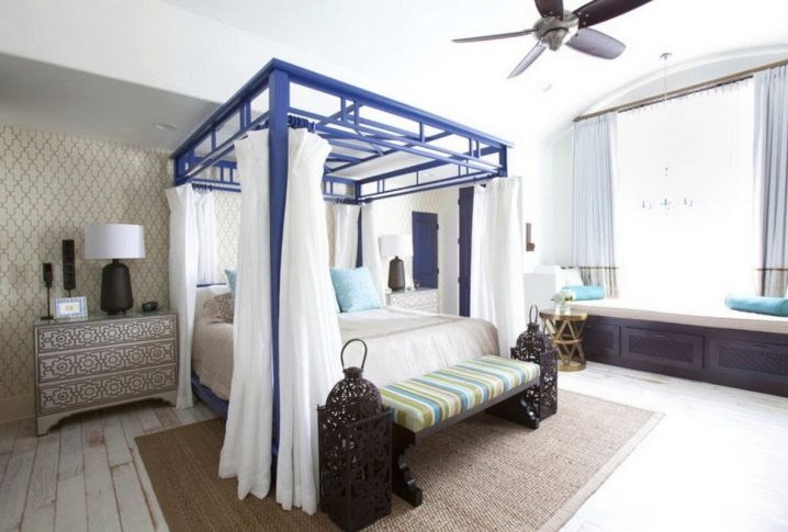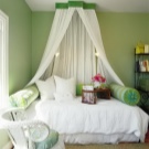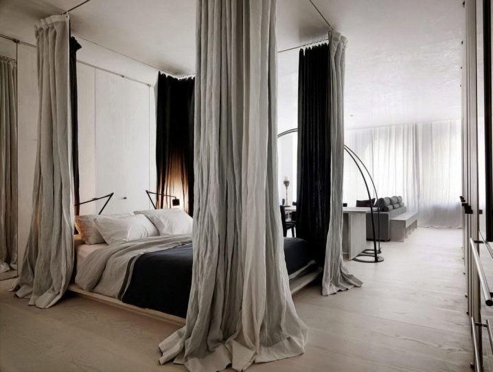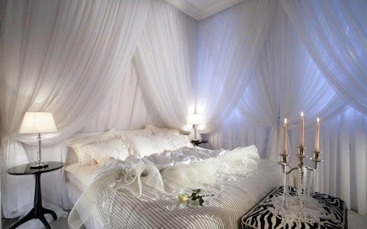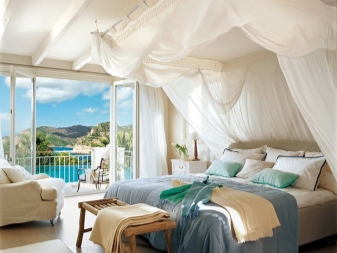 Дори не е нужно да се придържате към едно стилистично решение, а да играете с дизайни и цветове, създавайки нещо оригинално. Така че, можете да рискувате, като вземете балдахин от един стил и добавите към друг. Еклектиката е чудесен начин да съберете всичко по интересен начин. Има и много начини да окачите завеси. Не е необходимо да се затварят от всички страни и не трябва да висят по някакъв определен начин. Няма по -добро зрение от тънък, но осезаем облак пред очите, преди човек да заспи. Съблазнителна и романтична идея, която лесно се реализира.