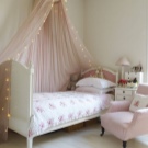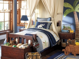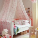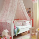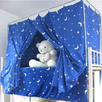 Сенникът ще работи добре за сложни конструкции като двуетажни легла или зони за игра. Разпръскването на цветни растения или невероятни животни ще служи като декорация за такъв дизайн.. Можете допълнително да фиксирате крушките (което ще се превърне в един вид нощна лампа за дете, което се страхува от тъмнината) или хартиена гирлянда от знамена.