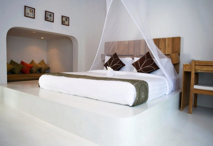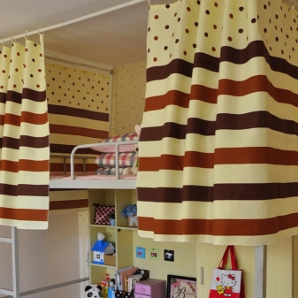- Ако като опора за легло се използват обемисти вертикални стелажи, след което за тях могат да се използват нетипични платнени драперии, като бушони, волани, гирлянди.
