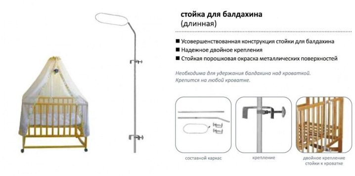 Възможно е да се фиксира корниз с малка дължина в тавана. Освен това можете да прикрепите 4 ламели по периметъра, които ще държат тъканта. Друг вариант е да смените държача с кука. Куката обаче ще попречи на регулирането на сенника. Най -практичният вариант е да закачите тъканта от пердетата, прикрепени към периметъра на яслите. Понякога тъканта е окачена на малък метален кръг, който е фиксиран към тавана..