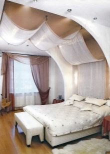 - Завеси с балдахин, който се състои от напречна греда, която ще бъде прикрепена към стената, а тъканта е хвърлена върху нея. Изглежда прост и непринуден, лесен за преместване и премахване за пране.