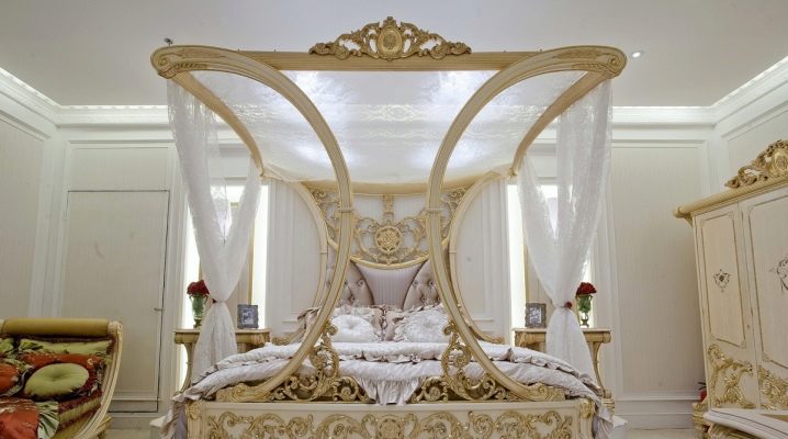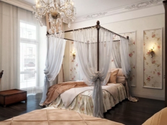 Основният атрибут на класическия стил със сигурност е структурата на издълбани дървени опори. Дървената рамка принадлежи към категорията селски сенници. Поставянето на малки завеси около нея ще направи стаята още по -уютна. Можете да опитате да си поиграете със стилове и да направите голямо дървено легло с масивен балдахин и издълбан гръб с цветни легла, което визуално компенсира теглото на конструкцията.