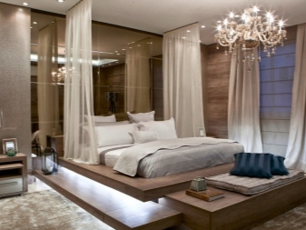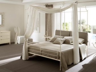 За модерен дизайн е възможно да се използва дървено легло. По този начин е по -добре да се отдалечите от изобилието от бижута и дърворезба. В допълнение, тъмното дърво ще направи чудесна комбинация със светли бели завеси.. Съвременният дизайн често включва игра с материали и форми.. Пълна дървена рамка може да не е подходяща за ниски тавани, но комбинацията от дърво и метал гарантира, че има достатъчно място за окачване на завеси и създаване на магическа атмосфера в спалнята. Когато избирате цвят поради липсата на място в стаята, можете да се спрете на бяло. Монохромната палитра ще направи пространството по -смислено. Всичко, което трябва да направите, е да инсталирате железни пръти на тавана и да опънете тъканта, така че да стигне до пода. Леглото ще се превърне в малка палатка. Резултатът е романтичен и магически интериор!