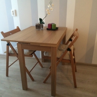 - Сгъването е не по -малко актуално маси за хранене, които марката е поставила в отделна категория. Такива продукти са по -скъпи от конвенционалните опции и изглеждат малко масивни..