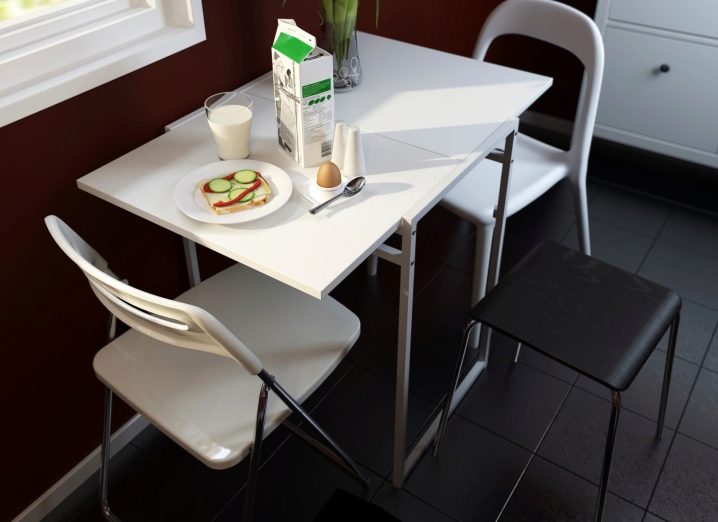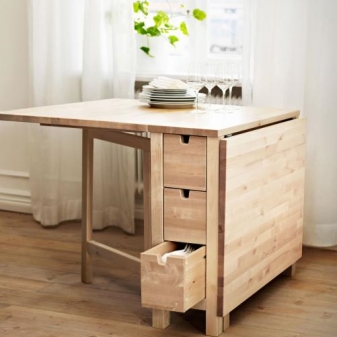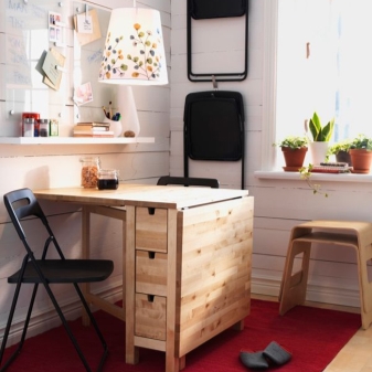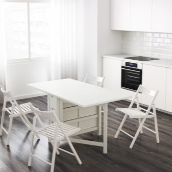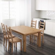 - Сгъваеми кухненски маси. Те заемат специално място в продуктовата гама на Ikea. Марката предлага огромно разнообразие от маси, които идеално ще се впишат в различни модерни кухненски интериори на апартаменти и частни къщи. Кухненските маси на Ikea често имат шест удобни и големи чекмеджета под плота за съхранение на различни аксесоари. Такива продукти се разглобяват много удобно, ако трябва да настаните членове на домакинството и гости. И също така се сгъват лесно. Идеален за спестяване на място.