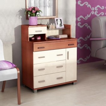 - MDF е достъпен материал с висока якост и издръжливост. Многоцветните чекмеджета в такъв скрин изглеждат много хармонично;