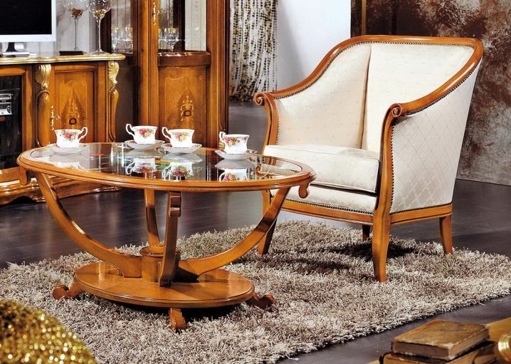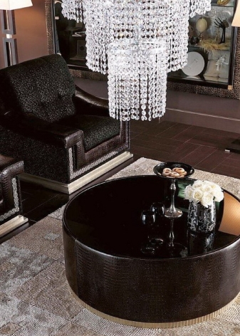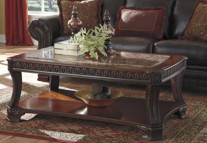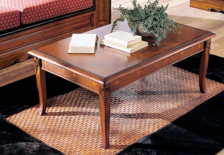 Истинските ценители на класиката ще харесат ниска и дълга маса с издълбани крака. Масивните мебели, изработени от ценни дървесни видове, ще добавят уважение към стаята.