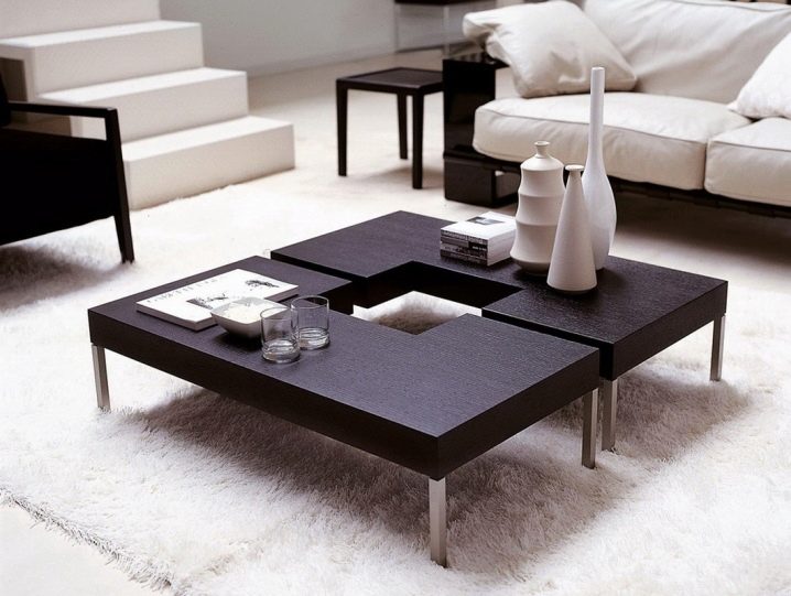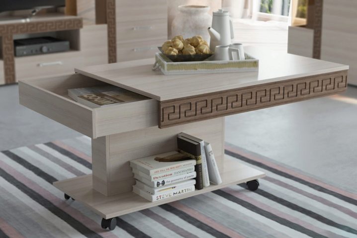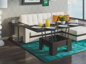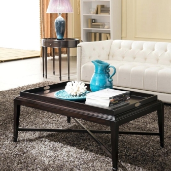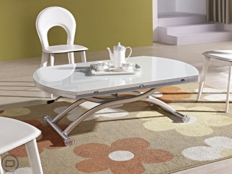 Когато в хола има светъл килим или в стаята има други лесно замърсени интериорни елементи, можете да изберете модел на масичка за кафе с повдигнати странични ръбове. Това решение ще ви помогне да избегнете неприятностите с разлято кафе или чаша вино, а също така ще поддържа стаята ви чиста след вечеря за деца. За такива цели ще бъдат удобни сервиращите модели с подвижен плот за маса..