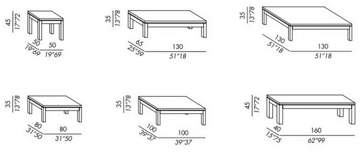Според класификацията на мебелите по височина, предложена от конструктивиста Льо Корбюзие, маси с параметри на височина 70 см и повече принадлежат към категорията маси за хранене, тъй като е удобно да седнете на столове зад тях. Стандартът за масичка за кафе, според него, са моделите с височина от 40 см до половин метър. Именно тази височина на масата ще ви позволи удобно да седнете зад нея на меко кресло или малък пуф.
