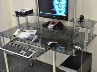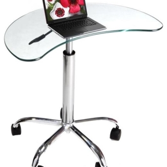 - прозрачната повърхност ви позволява да контролирате състоянието на системния блок и работата на индикаторните лампи, разположени под плота на масата. Когато на масата на компютъра се консумират топли напитки, термичните повреди под формата на кръгове не остават върху стъклото. Благодарение на металната рамка, продуктите имат сгъваема трансформаторна конструкция, могат лесно да бъдат демонтирани и преместени на желаното място. Има и възможност за регулиране на височината, ъгъла на наклона и въртенето на работните повърхности. Продуктите често са оборудвани с колела, което прави конструкцията по -мобилна;