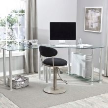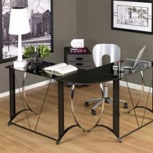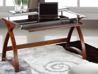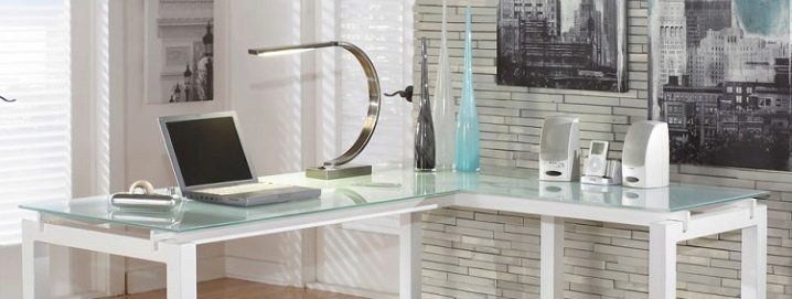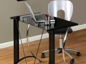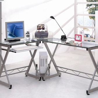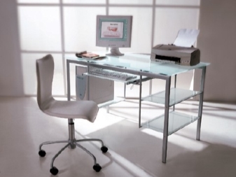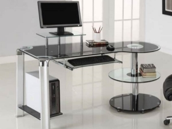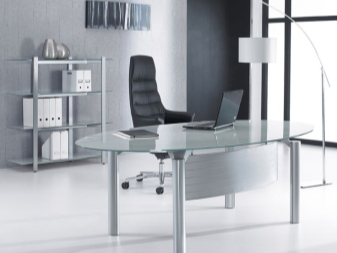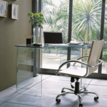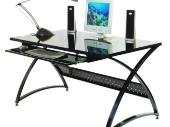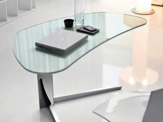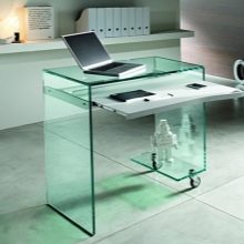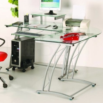 - стъклените модели не затрупват визуално стаята дори и с големи размери. Продуктът е оборудван с всички необходими устройства, които ви позволяват удобно да поставите съпътстващата офис техника, това ви позволява да оборудвате пълноценно работно място, без да използвате многобройните кутии и пиедестали, характерни за дървени маси. Когато използвате лаптопи, е възможно да закупите продукт с малък размер, състоящ се от работна повърхност и метални опори, което е удобно за поставяне на оборудване в малки помещения;