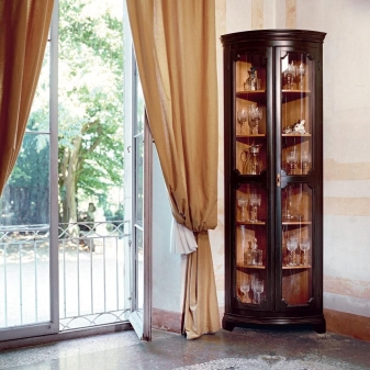 - Ъглови модели шкафовете със стъкло са малки и подвижни. Дизайнът ви позволява да поставите мебели в ъгъла на всяка стая, без да заемате допълнително пространство. Обикновено тези шкафове са декоративни и се използват за съхранение на книги, снимки и сувенири. В детската стая гардеробът ще служи за поставяне на малки играчки и колекции..