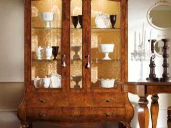 - Витрини. Мебелите са напълно или частично прозрачна структура. В някои случаи шкафът е допълнен с малки чекмеджета. Такива модели могат да бъдат разделени на подови, висящи и вградени..