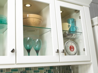Стъклените плочи трябва да са с дебелина най -малко 4 мм. В противен случай фасадата няма да може да издържи на механични натоварвания. Съвременните производствени методи дават възможност за получаване на различни видове стъкло за шкафове: релефни, шарени, резбовани, матови, оцветени, класически прозрачни и дори цветни опции. Цветното фасадно стъкло често е украсено с резбовани шарки, които компенсира липсата на прозрачност.