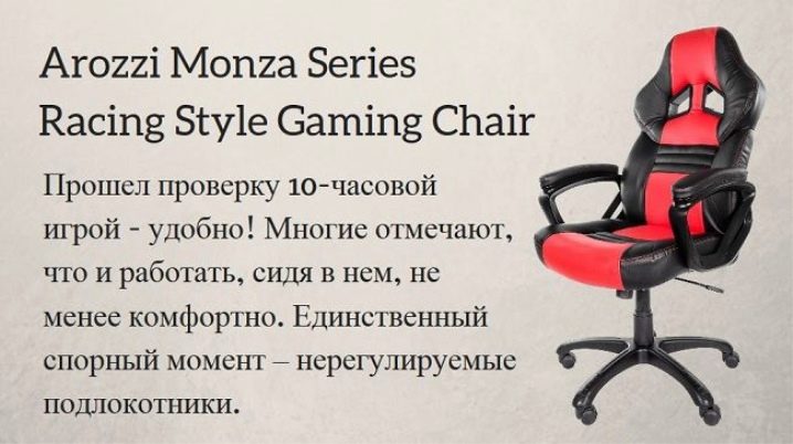 - Друг известен модел от Arozzi – “Игрален стол от серия Monza в състезателен стил”. Този модел е в състояние да поддържа удобна позиция на играча за 10 часа.