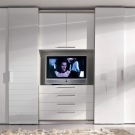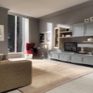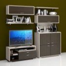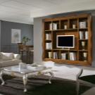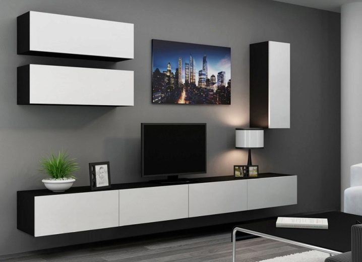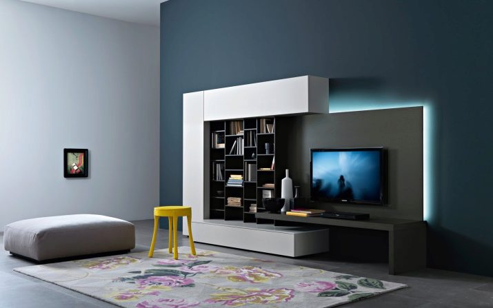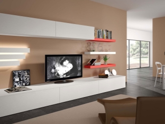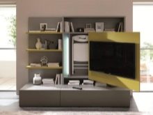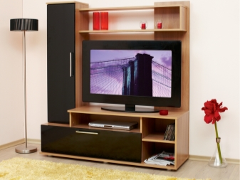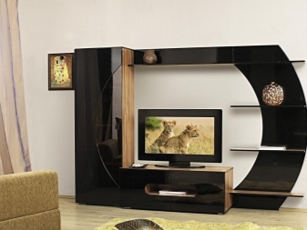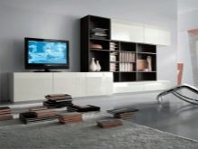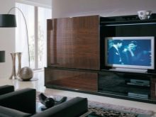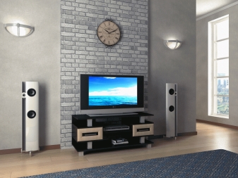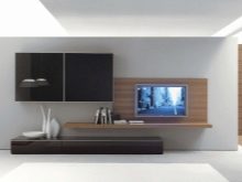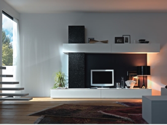 Такива мебели обикновено се избират от минималисти. Телевизорът може да бъде поставен на този пиедестал или да бъде окачен в центъра. Такъв интериор често се избира за стаи, където живеят млади хора..