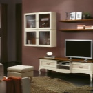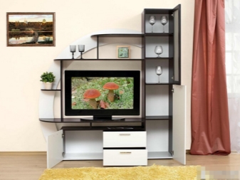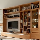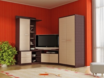 Ъгловите мебели винаги са ви позволявали да спестите място, тъй като е трудно да заемете пространството в ъгъла на стаята. Обикновено освен мястото за телевизор, което най -често се намира в центъра, има и рафтове за високоговорители, книги.