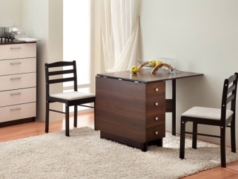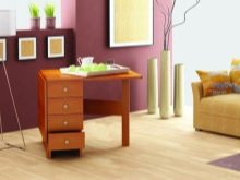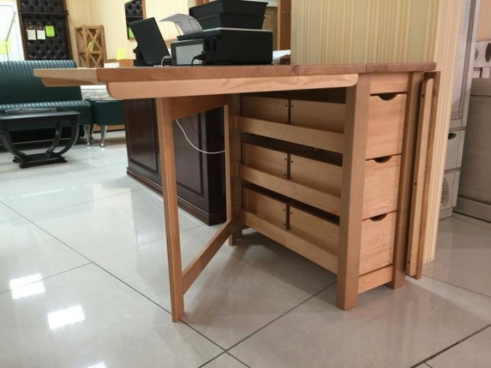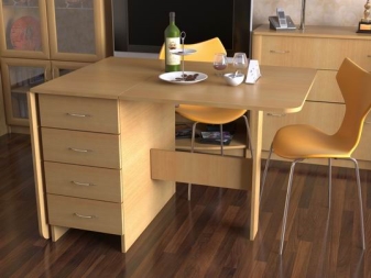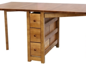 - Масата за пиедестал, оборудвана с чекмеджета, може да се използва като функционална нощна шкафче дори в сгънато състояние. Броят на кутиите може да варира от една до 5 броя. Подобен продукт може да се използва с еднакъв успех както в кухненското студио (в чекмеджетата на което домакинята ще съхранява кухненски прибори или други важни предмети), така и в хола, особено ако домакинята обича някакъв вид ръкоделие (конци, ножици, плат, хартия и др.).