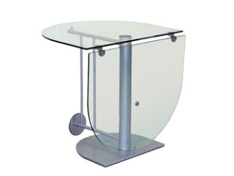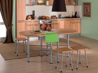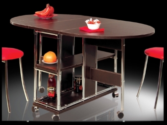 Ако стаята е готова в модерен стил, след това изберете трансформиращи се маси с плот, направен под формата на кръг или овал. Краката на такъв продукт също трябва да бъдат изразителни и да се различават по нестандартни конусовидни форми. За удобство можете да вземете модел, съдържащ допълнителни колела.