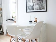 Белият цвят ще представлява елегантността на интериора в благоприятна светлина, показвайки изискания вкус на собственика си. Маси с бял плот най -често се използват от дизайнерите в стаи, декорирани в стила на минимализма или висока технология.