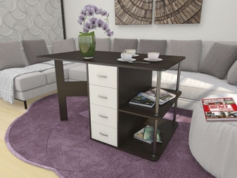 - Маса с допълнителни рафтове. Сгъваемият модел позволява не само съхранение на различни дреболии, но и поставяне на красиви декоративни елементи по рафтовете. Такъв продукт ще се превърне в декорация на стаята, в която има.