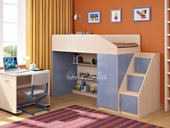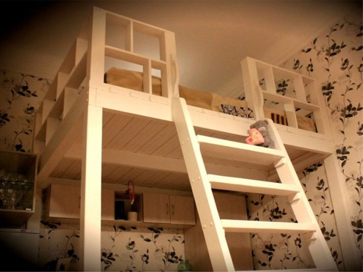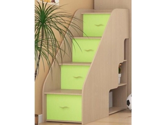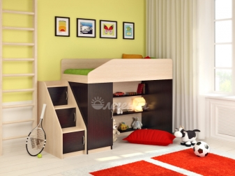 - Модели със стъпала на чекмеджетата по -удобни, но заемат отделно място отстрани. Не винаги е възможно да се подредят такива тавански легла в малка стая. Въпреки това, в такива модели кутиите за играчки или дрехи са разположени под стъпалата, което спестява място в останалата част от зоната и стаята като цяло. Тази опция е подходяща и за тези, които трябва да блокират достъпа до горното ниво за по -малки деца..