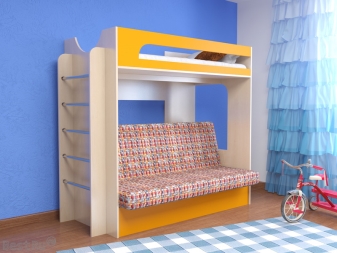 Долният ред предполага поставянето на функционално пространство, което може да бъде определено за игра, работна зона и зона за съхранение. Някои модели са оборудвани с диван, където можете да играете с приятели или да слушате приказките на майката преди лягане.