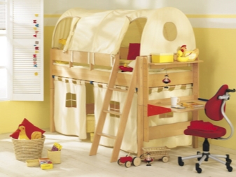 Лесно е да превърнете легло с детска площадка в приказна къща. За да направите това, не е необходимо да купувате модели, проектирани под формата на замък, опцията за стационарен дизайн може да се отегчи с течение на времето. Но да се правят „стени“ и „врати“ независимо е по силите на всеки родител. Завеси, ушити от изобретенията на мама или татко, направени от картон – всичко това ще внесе елемент на игра в комуникацията с детето и ще затрудни бебето дълго време.