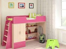 - Първият вариант спестява място, но може да не е безопасен за най -малките., и едва ли е подходящ за растящи момичета. Също така, колкото по -стръмна е стълбата, толкова по -трудно се изкачва. Има модели с наклонена подвижна инсталация, която при необходимост заема вертикално положение.
