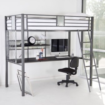 - С бюро. Метално легло с маса е един от най -популярните и достъпни модели на пазара на мебели. Това легло съдържа така наречения работен модул. Отгоре има легло и таблица отдолу, чието местоположение зависи от предпочитанията на собственика: