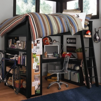 - Способността да се трансформирате. Долното ниво на леглото може да се състои от различни допълнителни модули, представени под формата на работна зона или още едно място за спане.