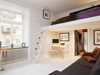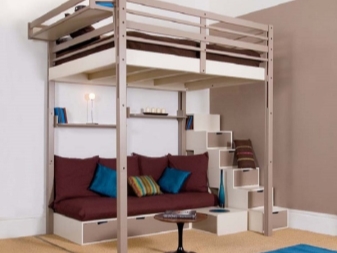 - С диван. Закупувайки легло на таванско помещение с мека мебел на долното ниво, собственикът на продукта получава допълнително пространство за отдих и сън, както и възможност да спести пари при закупуването на диван или фотьойл. Отделен диван и легло са много по -скъпи, отколкото в сложен модул.