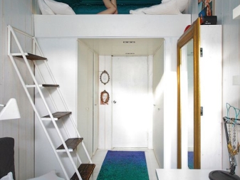 Таванското легло е незаменимо решение за малки пространства. Ако използвате конвенционални подови модели, те ще заемат почти цялото пространство на стаята, но ако зоната за спане е поставена на платформа над входа, тогава можете да спестите свободно пространство за нещо друго и носещата конструкция за спане модулът може да се използва като рафтове за лични вещи.