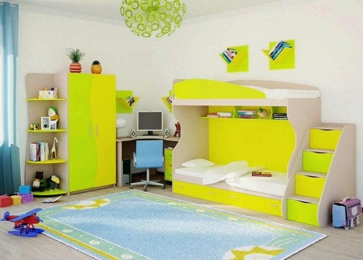 В този интериор е представен цял комплект мебели за детска стая, декорирани в ярко зелени и жълти цветове. Продуктите съдържат всичко, от което се нуждае едно дете: скрин, работна маса, стелаж и множество кутии за съхранение на вещи..