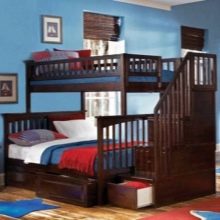 - Тъмни нюанси. Таванско легло в тъмни цветове изглежда много привлекателно, особено ако е с естествен цвят на рамка от тъмно дърво. Но моделите с тъмни цветове са по -подходящи за просторни стаи..