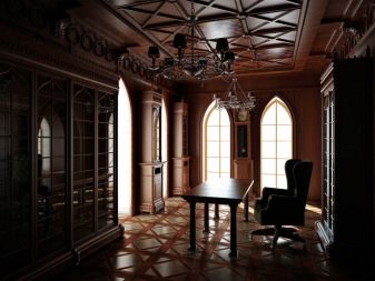 Домашният офис на истински мъж може да бъде направен в готически стил. Тя се различава от другите по това, че може да има военни мотиви. Мебелите за този стил са избрани масивни и дори леко груби..